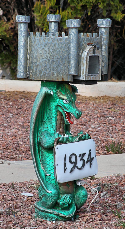 David Aber finds phenomenal mailboxes. Even by his usual standard, this one (a castle on top of a dragon?!) seemed too good to be handmade (which is one of the criteria for showing a box here). I'm sure there was no hint of that commercialization; if there were, he wouldn't have sent the photo. Still, I wondered: Was this mailbox really handmade?